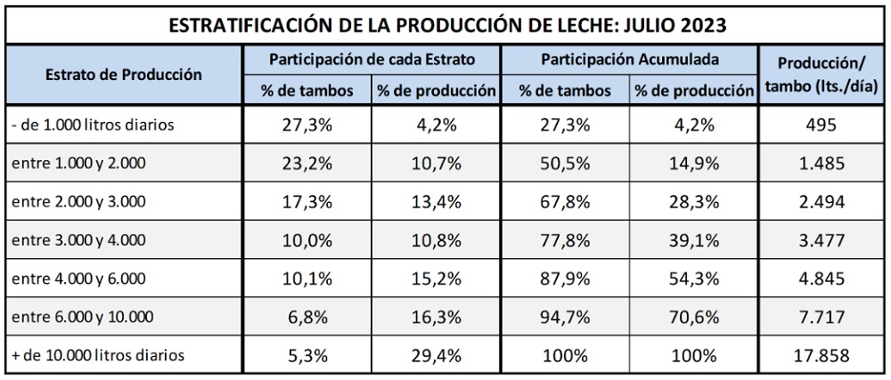Durante el mes de julio esos tambos promediaron 17.858 litros diarios, lo que significa un 97% más que lo que aportaron los 5.000 tambos de menos de 2.000 litros diarios y que fueron el 50,5% de los tambos totales, que representaron el 14,9% de la producción nacional.