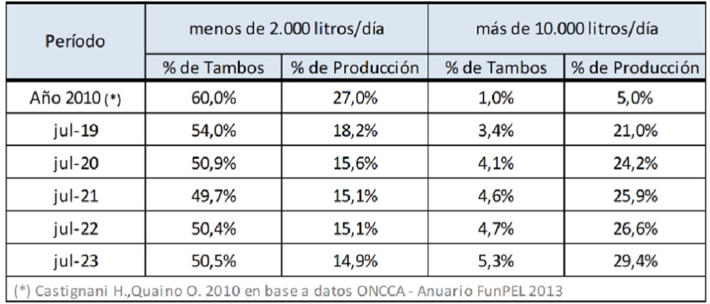 Entre 2023 y 2010 los tambos de menos de 2.000 litros de producción diaria redujeron un 45% su importancia relativa en la producción de leche total y los tambos de más de 10.000 litros diarios de producción, multiplican casi por 6 su participación en la producción.