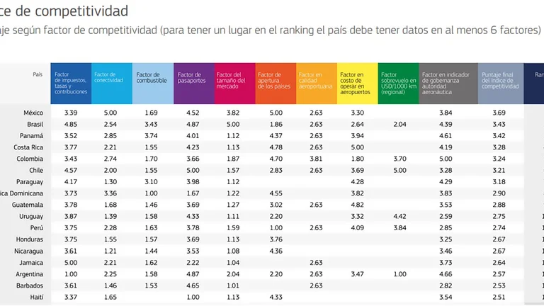 En términos de competitividad aérea, los tres países más competitivos de la región son México, Brasil y Panamá, según surge de las evaluaciones en base a diez “factores” , de los que para obtener un puntaje final un país debe producir datos sufientes en al menos seis.