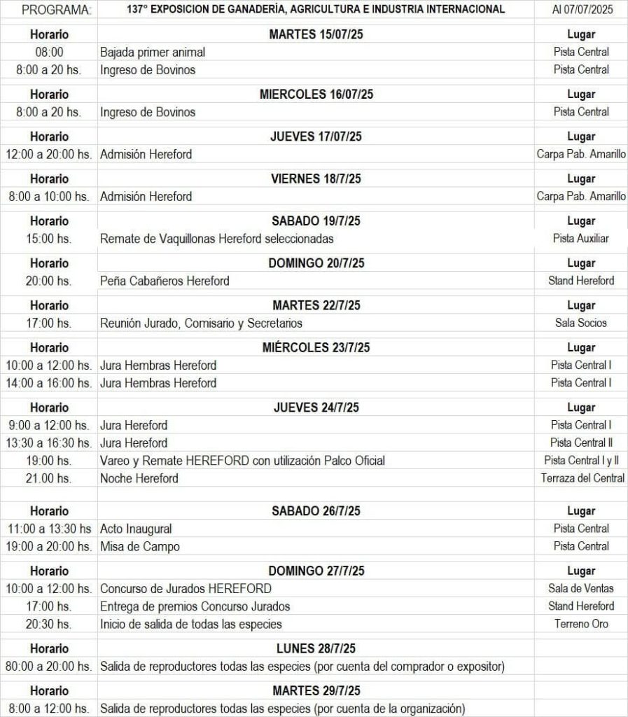 La jura será el viernes 25 de julio, a las 10:30 (hembras) y a las 14:00 (machos), en el sector 3 de la pista central de la Expo Rural 25. Estará a cargo de Diego Eder, productor ganadero de General Pinto (BA) y criador de la raza Braford, a la que cruza con Limousin. Las ventas serán el mismo viernes 25, a las 19:00.