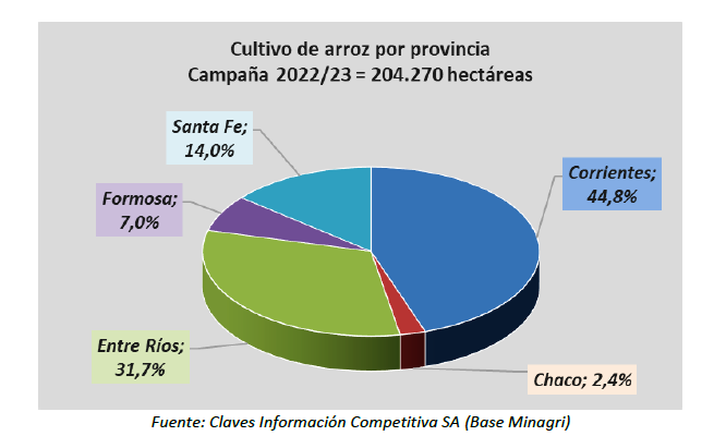 En la campaña actual 2022/23 la superficie estimada de arroz largo ancho es de 18 mil hectáreas lo que da una relatividad respecto de los arrozales totales de 8,8%. Entre Ríos y Corrientes lideran este cultivo con 8.200 hectáreas cada provincia. El arroz largo ancho ha recuperado algo de superficie respecto de campañas anteriores.