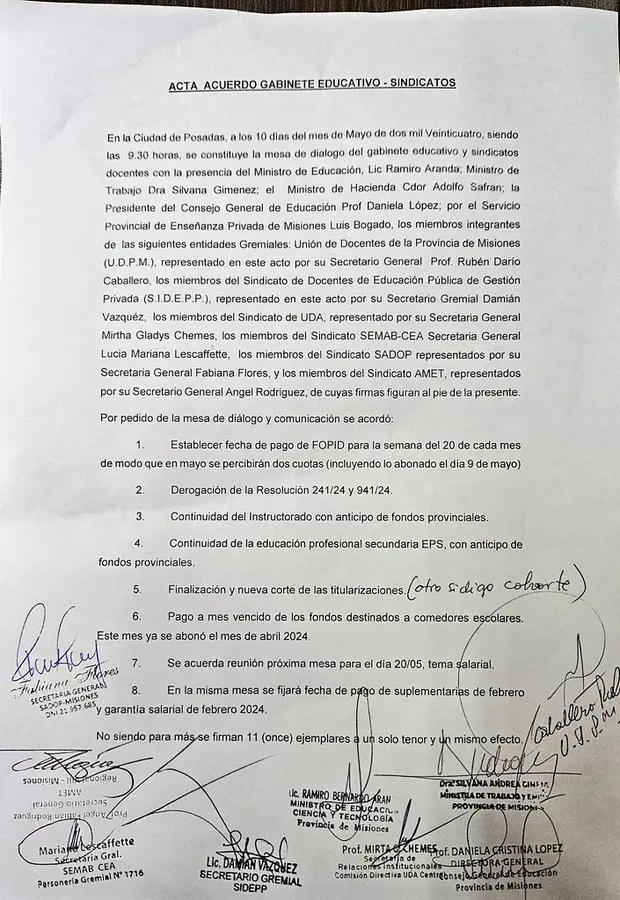 “Con los Gremios de la Mesa de Diálogo, se llegó al siguiente acuerdo de puntos importantes para resolver de la docencia misionera”, señala el comunicado oficial del Ministerio de Educación, Ciencia y Tecnología.