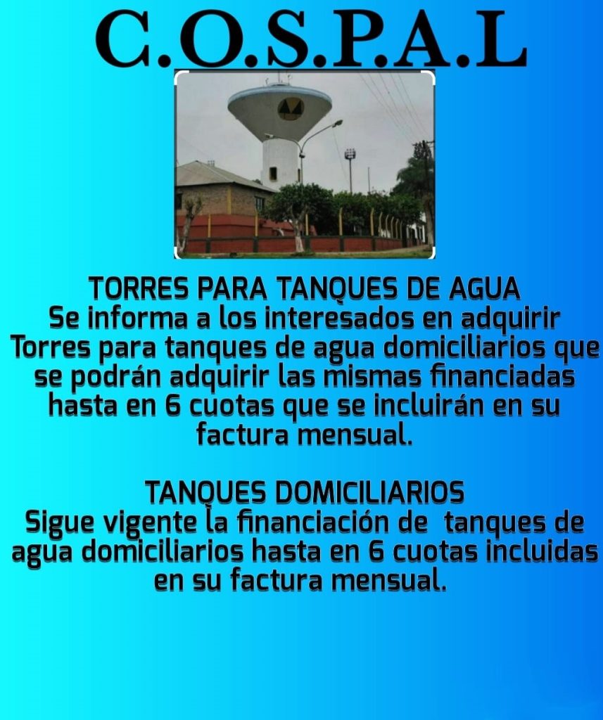 C.O.S.P.A.L.: Continúa vigente la adquisición de “torres” para los tanques domiciliarios del agua potable, los socios podrán abonar hasta en seis cuotas con la facturación mensual