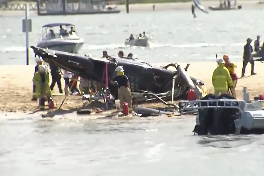 Esta imagen tomada de un video muestra un banco de arena con un helicóptero estrellado, víctimas y servicios de emergencia en Gold Coast, Australia - CH9