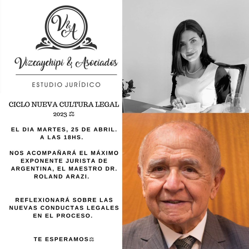 Invitan a Reflexionar en el Ciclo de Nueva Cultura Legal, será a través de la Plataforma de Instagram – @estudiovizcaychipi – con la coordinación de la Abogada y Escribana. Dra. María Elena Vizcaychipi, sobre Reflexionando junto al Gran Jurista Argentino Dr. Roland Arazi sobre las nuevas conductas legales en el proceso