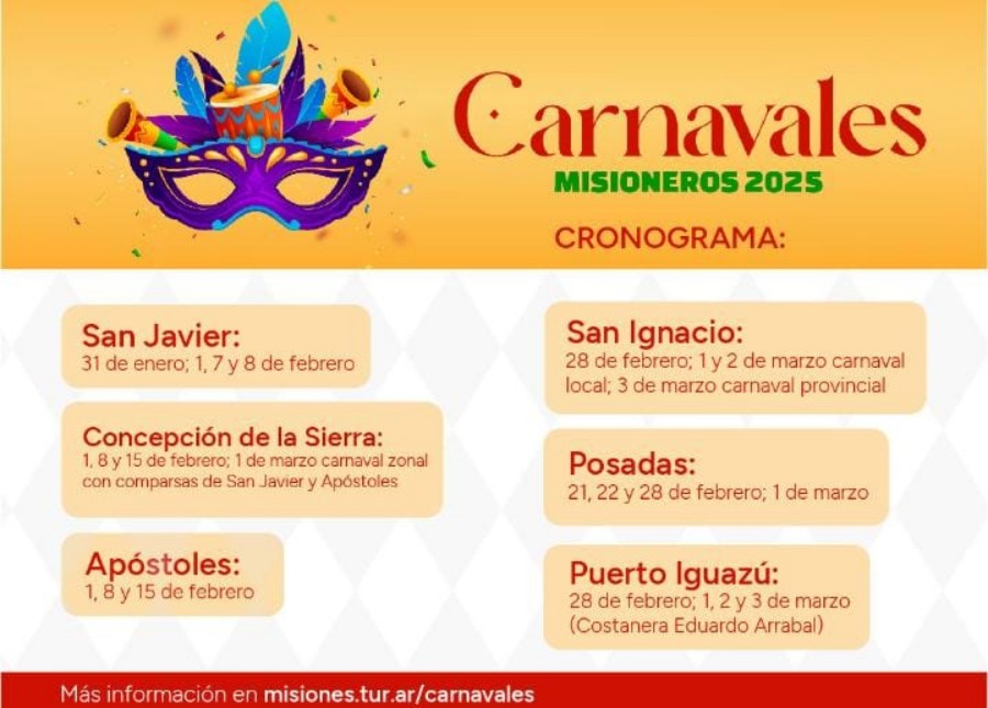 Este fin de semana comienzan los Carnavales Misioneros 2025. Con un cronograma ya definido, San Javier, Concepción de la Sierra, Apóstoles, San Ignacio, Posadas y Puerto Iguazú se preparan para desplegar todo su potencial y exponer el trabajo que vienen realizando. Desde el Gobierno de la provincia de Misiones destacaron que este evento además de reflejar el talento que existe en la provincia, también es una oportunidad muy importante para seguir potenciando el turismo y la economía local.