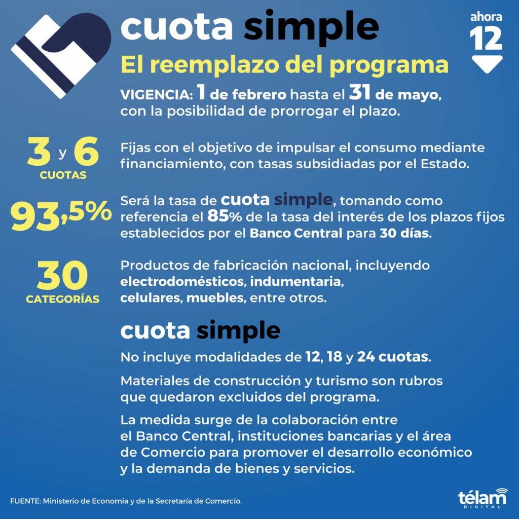 El programa Cuota Simple, que sustituye a Ahora 12, entró en vigencia este jueves y estará vigente hasta el próximo 31 de mayo, con el objetivo de fomentar el consumo brindando la posibilidad de financiar compras en tres y seis cuotas fijas - quedando discontinuadas las 12, 18 y 24 cuotas - con tarjetas de crédito bancarias y "con la tasa más baja del mercado", destacaron desde el Ministerio de Economía y de la Secretaría de Comercio.