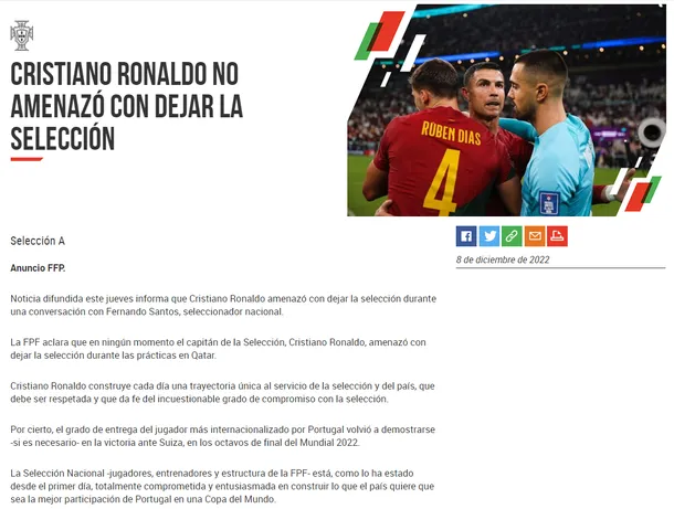 “La FPF aclara que en ningún momento el capitán de la Selección, Cristiano Ronaldo, amenazó con dejar la selección durante las prácticas en Qatar”, comenzó el comunicado de la Federación portuguesa de Fútbol.