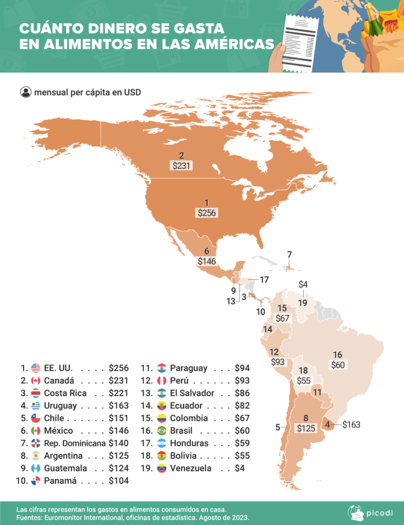 Comparando los montos de los gastos, en los países americanos los residentes de Estados Unidos (US$ 256/mes), Canadá (US$ 231/mes) y Costa Rica (US$ 221/mes) son los que más gastan en alimentos, lo que puede explicarse en parte por el nivel generalmente alto de precios en estos países.