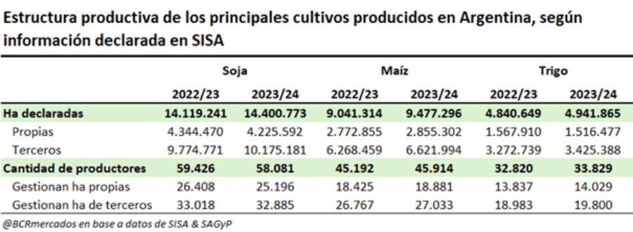 El documento, que toma datos del SISA (Sistema de Información Simplificado Agrícola) de la campaña 2023/24, señala que el 69,3% del área de trigo, el 69,9% del maíz y el 70,7% de la soja se produjo bajo el esquema de arrendamiento. Esto demuestra que la mayor parte de la producción agrícola está en manos de personas y empresas que asumen el riesgo de alquilar campos para operar.
