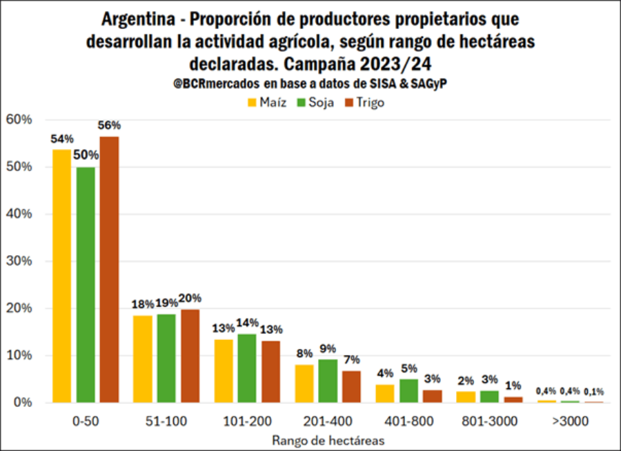 A pesar de que el informe identifica a 45.914 productores de maíz, 58.081 de soja y 33.829 de trigo, la mayor parte de los actores del sector son “pequeños productores”. En efecto, el 67% de los productores de trigo, el 54% de los de soja y el 60% de los de maíz gestionan menos de 100 hectáreas.