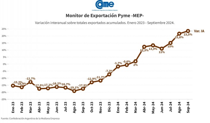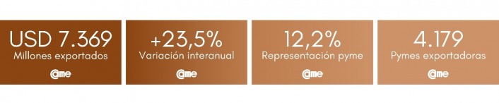 Así surge del Monitor de Exportación PyME (MEP), un indicador elaborado por el sector de Estadísticas e Informes de la Confederación Argentina de la Mediana Empresa (CAME), para medir las exportaciones de las pequeñas y medianas empresas de la República Argentina, en base al monitoreo mensual de las operaciones de las empresas argentinas en el comercio exterior. Se discrimina por su condición PyME declarada ante la Secretaría de la Pequeña y Mediana Empresa, Emprendedores y Economía del Conocimiento, dependiente del Ministerio de Economía de la Nación.