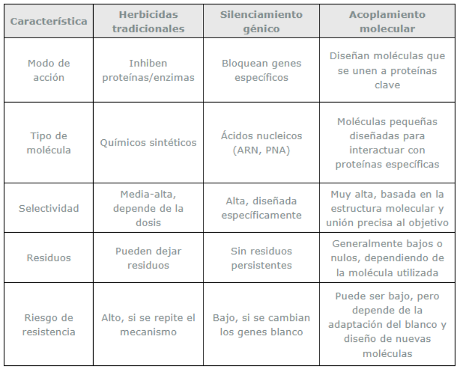 En este escenario, hay dos tendencias que están ganando terreno. Por un lado, el uso de herramientas digitales como el acoplamiento molecular para diseñar moléculas antes de fabricar fitosanitarios. Por otro, el silenciamiento génico, una estrategia que actúa sobre el ADN de las malezas en lugar de aplicar químicos tradicionales.