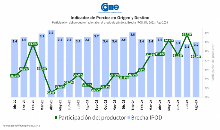 Los precios de los agroalimentos se multiplicaron por 3,2 veces del campo (origen) a la góndola (destino) en Agosto. Es decir, el consumidor pagó 3,2 pesos por cada peso que recibió el productor, según el Indicador de Precios en Origen y Destino (IPOD) elaborado por el sector de Economías Regionales de la Confederación Argentina de la Mediana Empresa (CAME).