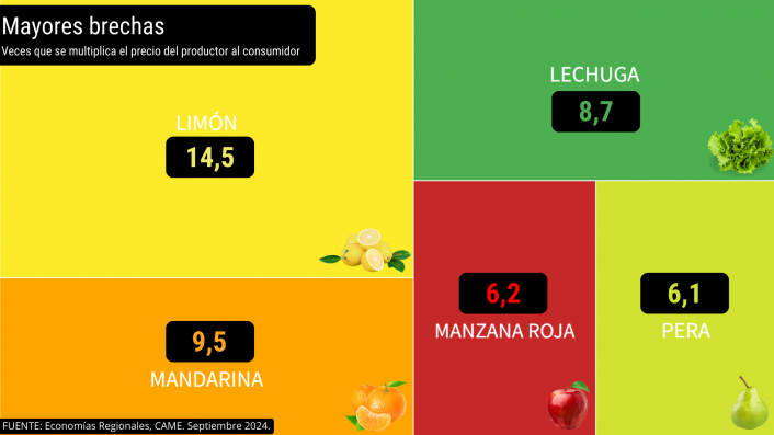 El limón (14,5 veces), la mandarina (9,5), la lechuga (8,7), la manzana roja (6,2) y la pera (6,1 veces), fueron los cinco productos que presentaron mayor diferencia entre los precios de origen y destino.