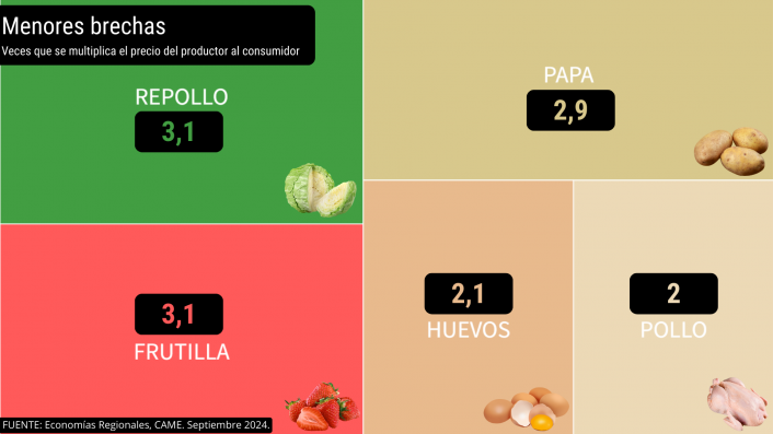 De los cinco productos que presentaron menor diferencia entre el precio que recibió el productor y el que pagó el consumidor, tres forman parte de la canasta frutihortícola y dos de la de origen animal.
