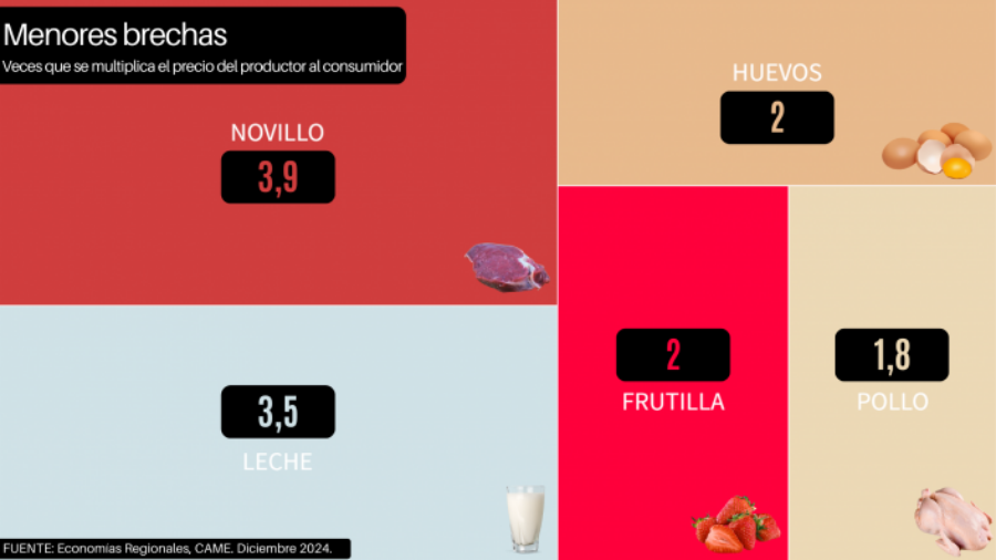 Con 1,8 veces, el pollo fue el producto con la menor brecha del mes, aumentando sus precios al productor (0,6%), y en la góndola (9,1%). Los huevos (2 veces), por su parte, subieron en origen (0,4%) y bajaron en destino (0,2%).