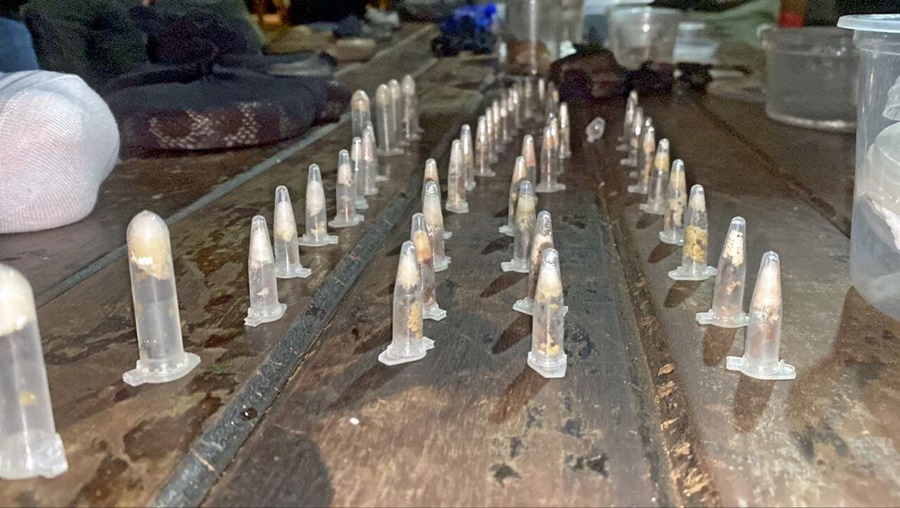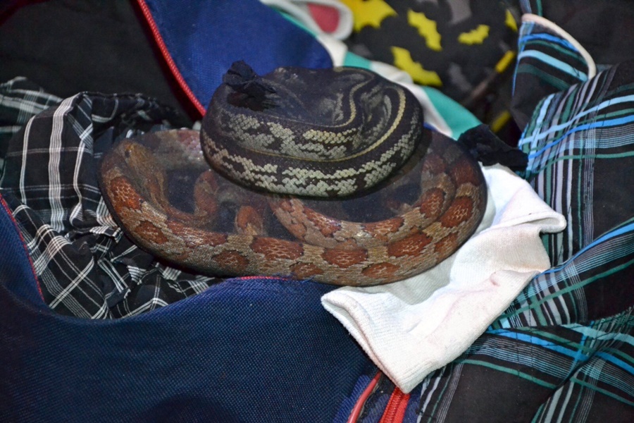 Al requisar la bodega se constató la presencia de dos bolsos de mano, en cuyo interior se encontraban numerosos recipientes plásticos, cápsulas y bolsas de red que contenían animales. Luego de identificar al propietario del equipaje, y ante la presencia de testigos, se confirmó la presencia de 90 serpientes de distintas especies, 236 ejemplares de arácnidos y 1 ciempiés.