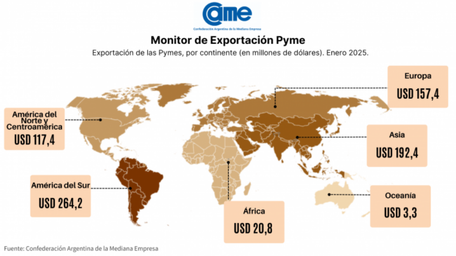 Así surge del Monitor de Exportación PyME (MEP), un indicador elaborado por el sector de Estadísticas e Informes de la Confederación Argentina de la Mediana Empresa (CAME), para medir las exportaciones de las pequeñas y medianas empresas de la República Argentina, en base al monitoreo mensual de las operaciones de las empresas argentinas en el comercio exterior, discriminando por su condición PyME declarada ante la Secretaría de la Pequeña y Mediana Empresa, Emprendedores y Economía del Conocimiento, dependiente del Ministerio de Economía de la Nación.