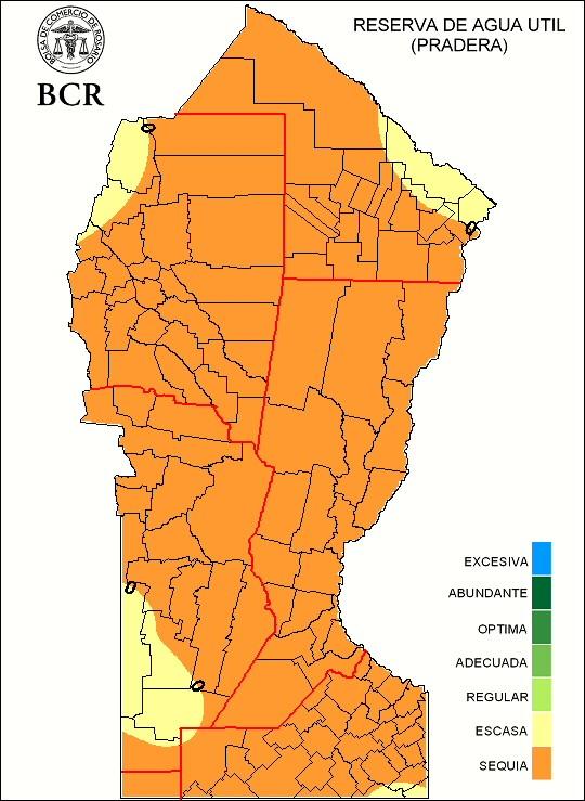 Los mapas de condición hídrica siguen mostrando características muy negativas en toda la zona GEA, con condiciones de sequía en la mayor parte de la región y reservas escasas en el resto en una acotada porción. Para alcanzar niveles óptimos de humedad edáfica en las próximas 2 semanas se necesitarían registros de más de 140mm en toda la región GEA, con núcleos máximos que alcanzan los 180mm, situación muy difícil de revertir.