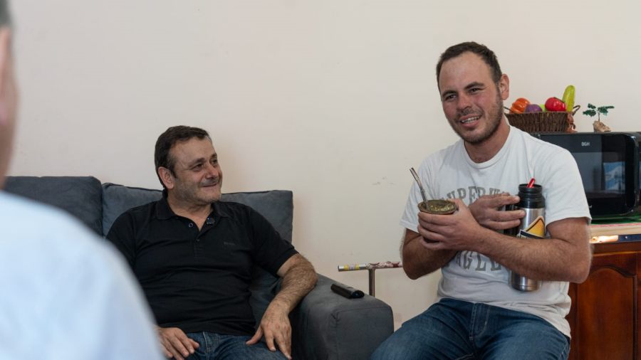Durante la visita, los funcionarios compartieron un momento más informal con la familia, tomando mates y pan cuca en el nuevo hogar, mientras conversaban sobre la vida en el barrio y los proyectos familiares.