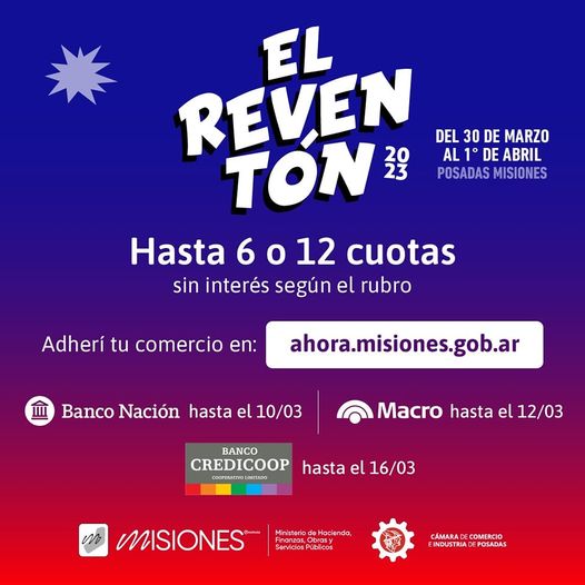 Del jueves 30 de Marzo al sábado 1° de Abril estará vigente en la ciudad de Posadas la octava edición de “El Reventón”, un evento cultural y comercial que permitirá realizar compras en hasta 6 o 12 cuotas sin interés (según el rubro) con topes de financiación de 132 mil y 264 mil pesos respectivamente.