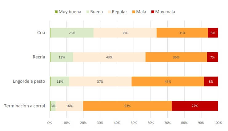 La actividad ganadera en donde más pesimismo exhibieron los productores fue el encierre a corral. Un 27% consideró que la situación será muy mala y un 53% vaticinó que será mala. En el caso de engorde a pasto, un 8% muy mala y un 43%, mala. En la vereda opuesta, un 26% consideró que el escenario para la cría en 2023 será bueno, el mayor porcentaje de optimismo entre los ganaderos relevados.