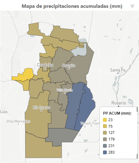 En Departamentos como Marcos Juárez y Unión se destacan picos de 49,7 y 47,5 qq/ha, respectivamente, confirmando la incidencia positiva de las abundantes lluvias en toda la región
