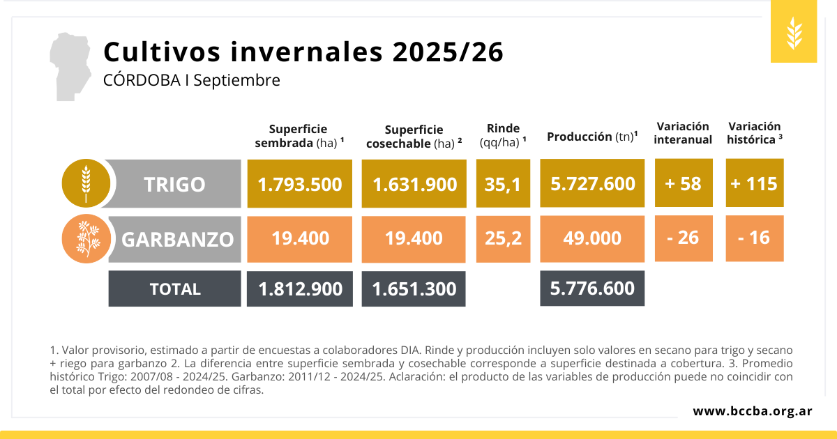 De acuerdo con un relevamiento realizado entre el 8 y el 15 de septiembre por el Departamento de Información Agronómica, la provincia de Córdoba podría alcanzar la mayor producción de trigo de su historia: 5,7 millones de toneladas, con un rendimiento promedio de 35 quintales por hectárea.