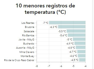 En el caso particular de Córdoba, por ejemplo, la Administración Provincial de Recursos Hïdricos (APRHI) reportó como valor más bajo del día -7,6°C en la localidad de Los Reartes, en la zona serrana; mientras que entre las regiones agrícolas, el menor guarismo fue -6,6° en Nicolás Bruzzone, en el extremo sur de la provincia.