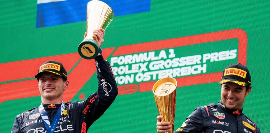 Foto.- GEORG HOCHMUTH / APA / AFP) / Austria OUT - Max Verstappen celebra su victoria y Sergio Pérez su tercer puesto en el Gran Premio de Austria de la Fórmula 1