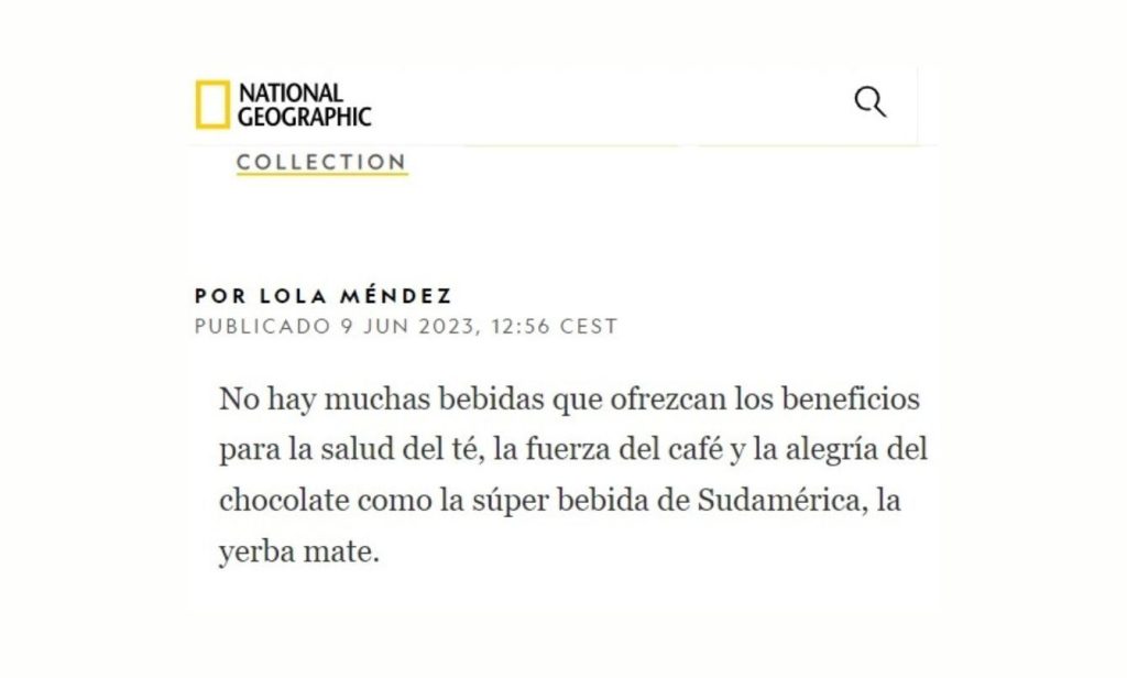 El artículo fue publicado el 9 de Junio pasado (https://www.nationalgeographic.es/ciencia/2023/06/que-es-yerba-mate-saludable), escrito por Lola Méndez, periodista uruguaya-estadounidense dedicada a temas sobre sostenibilidad, viajes, cultura y bienestar.
