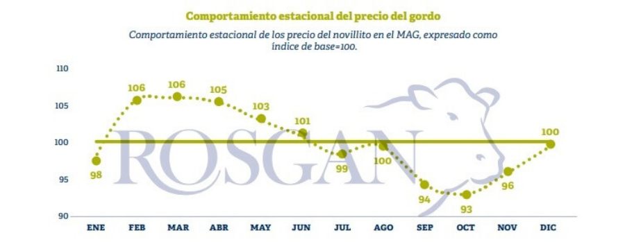 Un análisis de los valores históricos, ajustados a un índice base 100, muestra que los mayores incrementos se concentran en el primer semestre, especialmente en Marzo, Abril y Mayo, donde el precio se ubica entre un 3% y un 4% por encima del promedio anual.