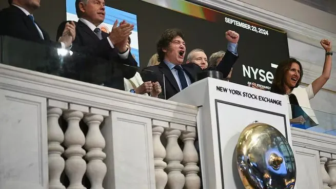 Javier Milei participó de la apertura de la jornada bursátil en la Bolsa de Valores de Nueva York.
