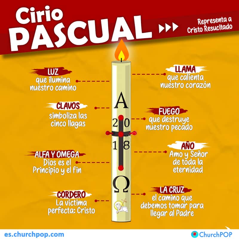 A continuación, compartimos una infografía de nuestros amigos de Church Pop que nos muestra al Cirio Pascual y sus distintos elementos simbólicos: