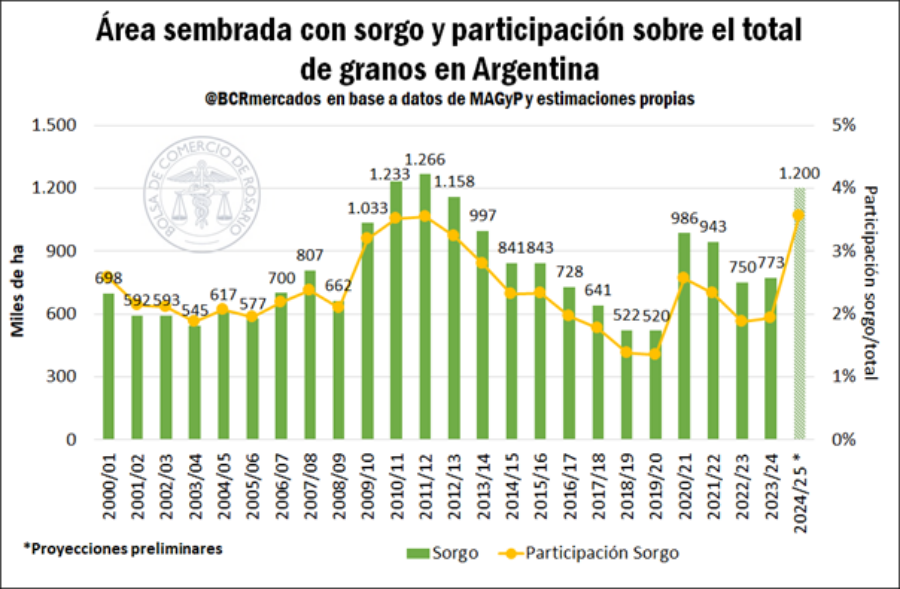 El área sembrada con sorgo a nivel nacional para el ciclo 2024/2025 podría pasar de unas 750.000 hectáreas sembradas el año pasado, hasta 1.200.000 hectáreas en el mejor de los escenarios para este 2024, según las primeras proyecciones que la BCR viene manejando de manera no oficial.