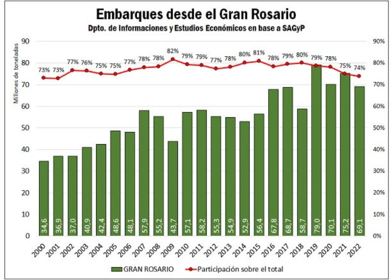 En 2022, desde los puertos argentinos se embarcaron 93,5 millones de toneladas de productos agroindustriales. Esta cifra representa una caída interanual de 7%, de acuerdo a la Bolsa de Comercio de Rosario (BCR).