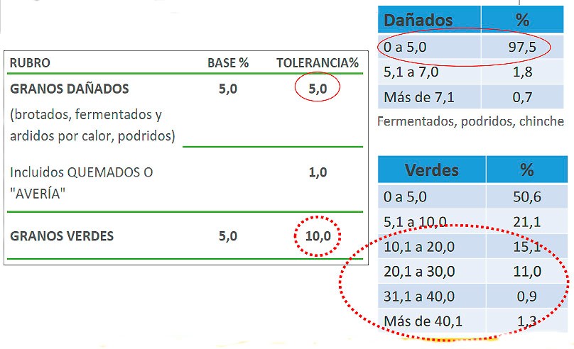 Este es un tema que merece la atención pues hay lotes con alto porcentaje de semillas verdes que pueden tener una calidad aceptable, mientras que en otros lotes esto puede ser diferente, y por ello es menester la realización de un análisis. También las abolladuras son consecuencia de condiciones muy estresantes del ambiente durante la etapa de desarrollo de las semillas.