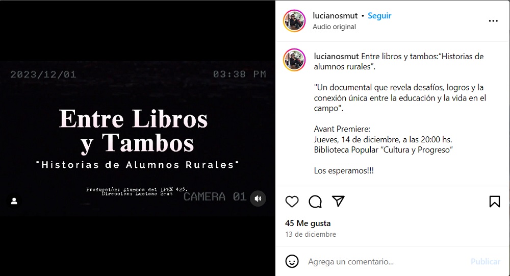 Se trata de una producción audiovisual realizada por alumnas y alumnos del Ipem 435 de Morteros (Córdoba) dictado por el profesor Luciano Smut en la que refleja la vida del estudiante rural, donde va amalgamando el estudio, la asistencia a clase, la realización de las tareas escolares con el trabajo en el tambo, el ordeñe, la alimentación de las vacas entre otras actividades que requiere la lechería realizados por las alumnas y alumnos junto a sus familias.