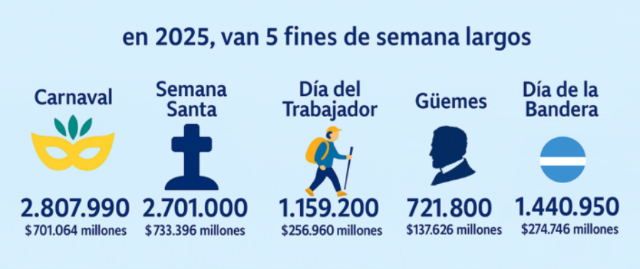 De acuerdo con los datos elaborados por el sector Turismo de la Confederación Argentina de la Mediana Empresa (CAME), en lo que va del año ya se celebraron cinco fines de semana largos, en los que viajaron 8,8 millones de turistas por distintos puntos del país. Estas escapadas representaron un movimiento económico estimado de 2.103.791.000 pesos, lo que equivale a 1.821 millones de pesos.