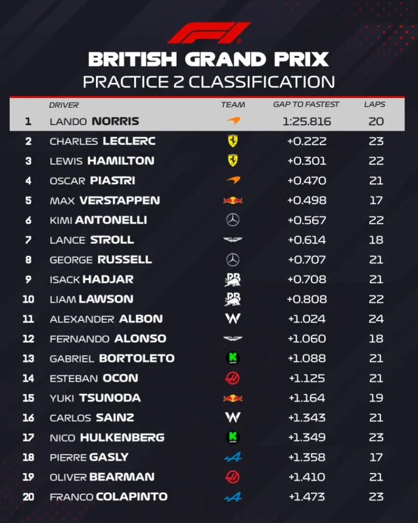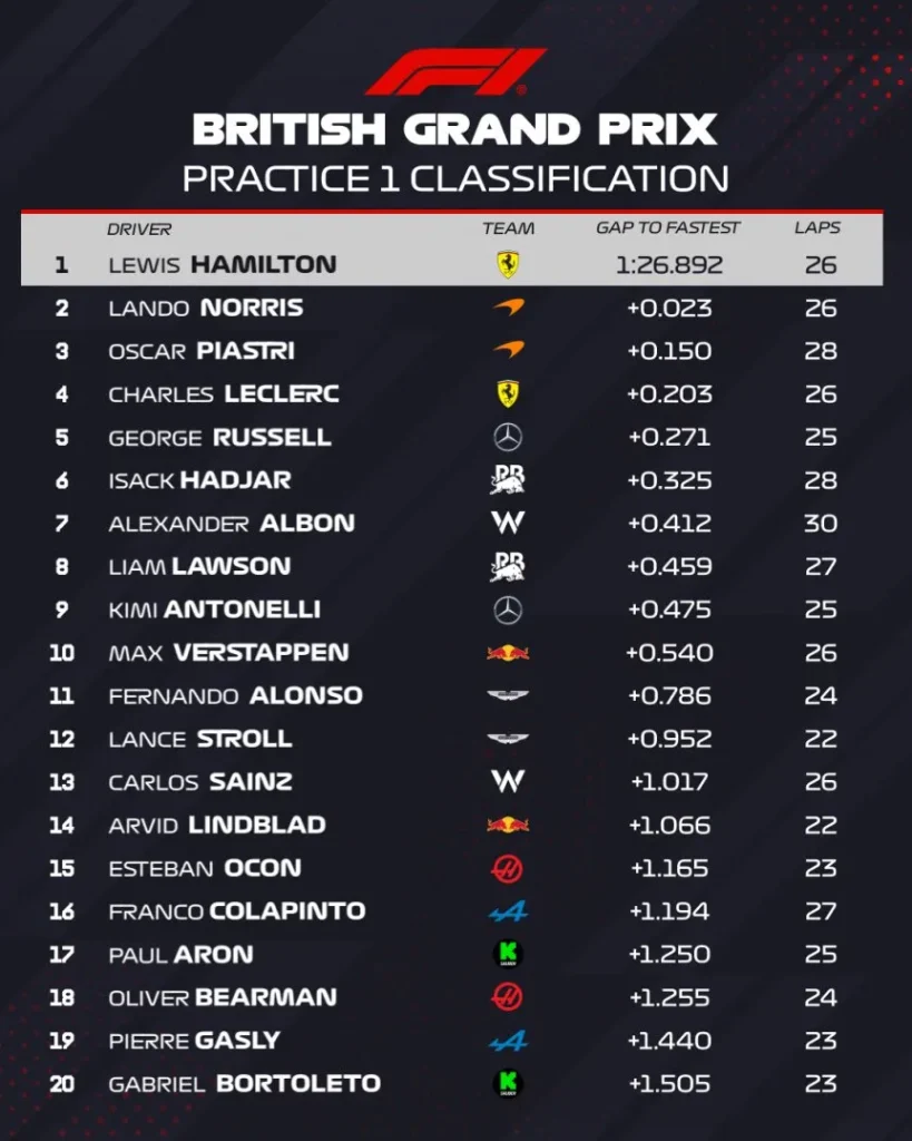 Hamilton, en su circuito predilecto, se hizo fuerte y ganó su primera práctica libre de la temporada. Registró un tiempo de 1:26.892, 23 milésimas por encima de Lando Norris. Completó el podio el líder del campeonato, Oscar Piastri, que quedó a una décima y media del siete veces campeón del mundo con Mercedes. El que tuvo una floja sesión fue Max Verstappen, que culminó décimo a más de medio segundo de uno de los grandes rivales de su carrera.