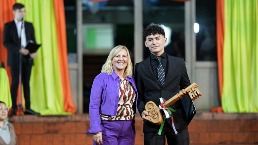 El evento comenzó con la entrega simbólica de la Llave de la Ciudad por parte de la Intendente María Eugenia Safrán al Presidente de la Asociación de Estudiantes Secundarios de Apóstoles, Andrés Ferraz. Este gesto representó el traspaso de autoridad a los estudiantes, quienes asumieron el liderazgo durante la jornada.