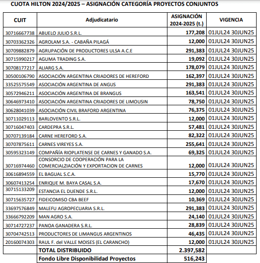 En concreto, en lo que respecta a la Cuota Hilton propiamente dicha, que va a parar a países de la Unión Europea, lo que distribuyó el Gobierno en esta oportunidad fueron 28.346,23 toneladas, ya que las 1.042,76 restantes quedaron dentro del “fondo de libre disponibilidad”, que se puede usar cuando las empresas o proyectos ya agotaron su cupo establecido.