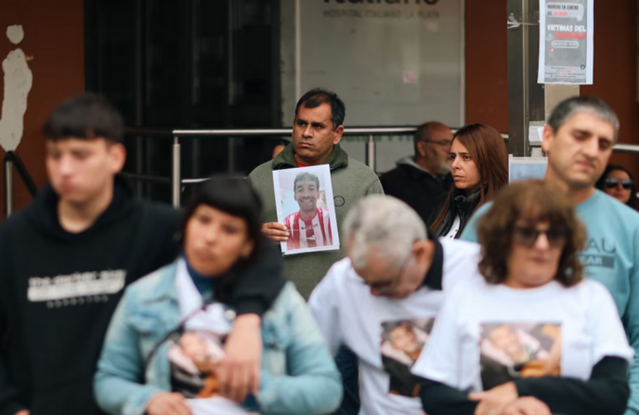 Familiares de víctimas mortales por el uso de fentanilo asisten a una manifestación frente al Hospital Italiano de La Plata (EFE)
