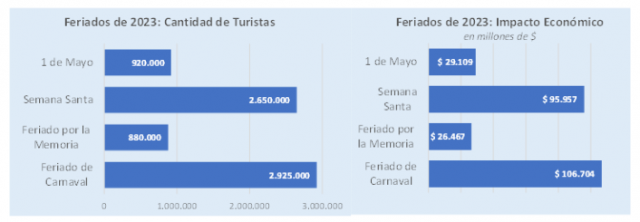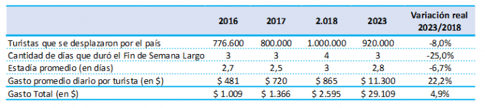 En el cuarto fin de semana largo del año, entre el pasado viernes y hoy lunes, unos 920 mil turistas viajaron por la Argentina y desembolsaron 29.109 millones de pesos en alimentos, bebidas, alojamiento, transporte, recreación y compras diversas.