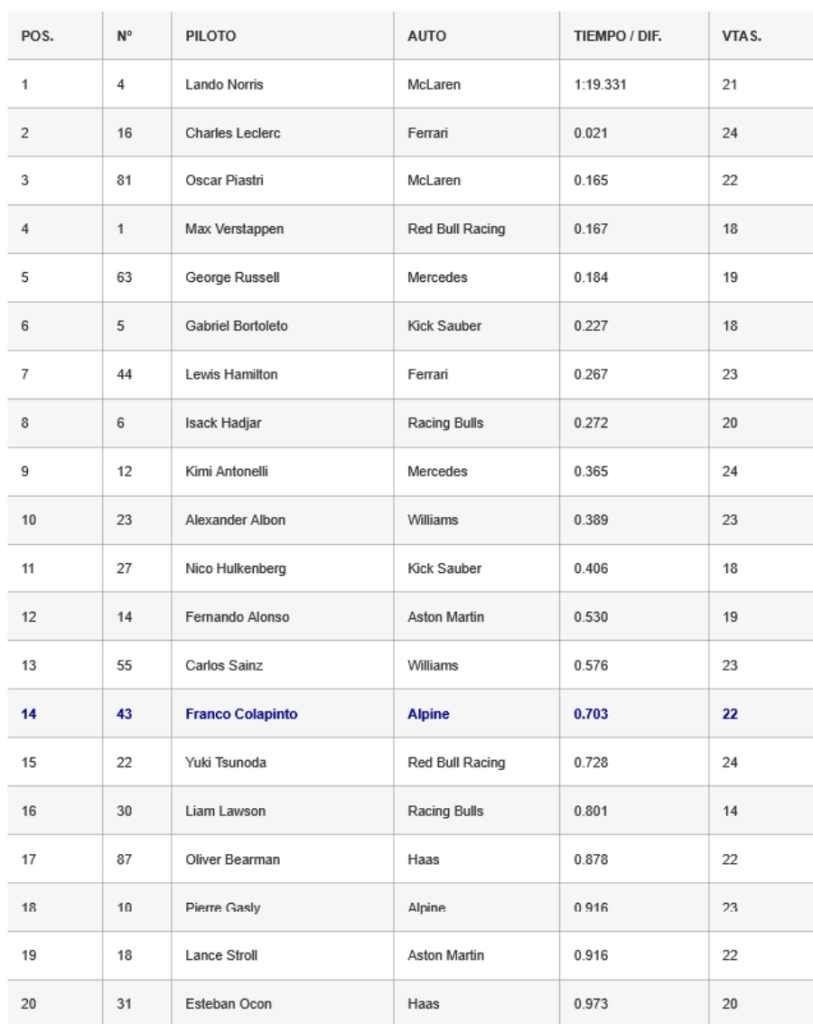 El líder del campeonato Oscar Piastri se ubicó tercero con el otro McLaren, a 0s165, precediendo al Red Bull de Max Verstappen (a 0s167), al Mercedes de George Russell (a 0s184), al Sauber de Gabriel Bortoleto (a 0s227), a la Ferrari de Lewis Hamilton (a 0s267) y al Racing Bulls de Isack Hadjar (a 0s272).