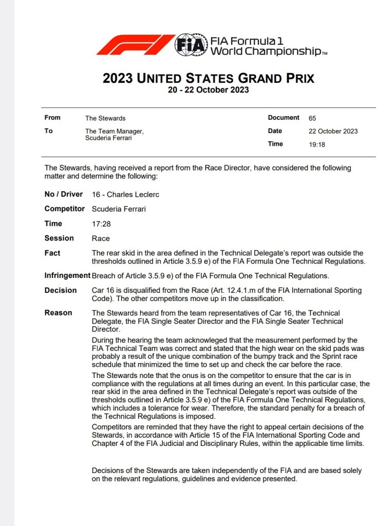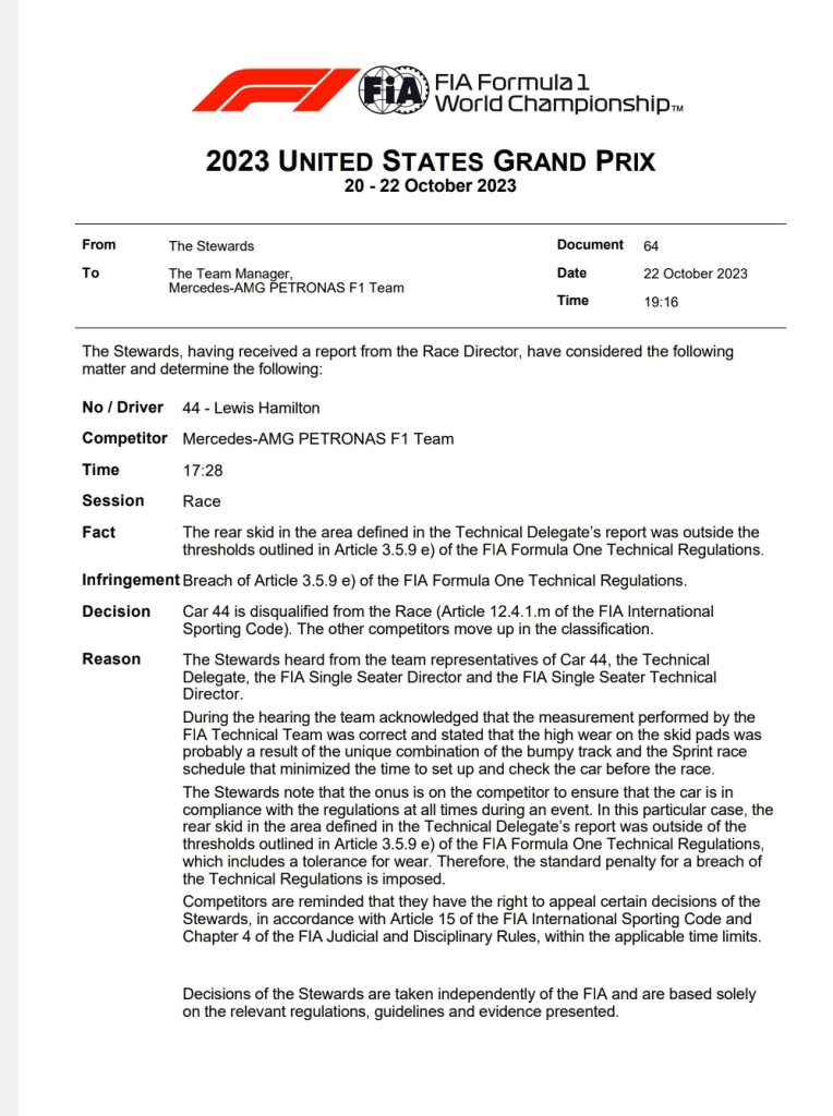La inspección técnica posterior a la carrera detectó que partes del piso en los autos de los pilotos de Fómula 1 de; Mercedes, Lewis Hamilton y Ferrari, Charles Leclerc no cumplían con las regulaciones referidas al espesor de las tablas con las que deben estar construidos.