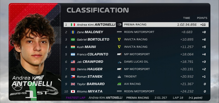 Luego de finalizar las 21 vueltas, el podio de la carrera Sprint quedó conformado por el poleman Andrea Kimi Antonelli, en segundo lugar Zane Maloney y en el tercer puesto Gabriel Bortoleto. Franco Colapinto finalizó quinto con una diferencia de +6.807s por debajo del Pole.
