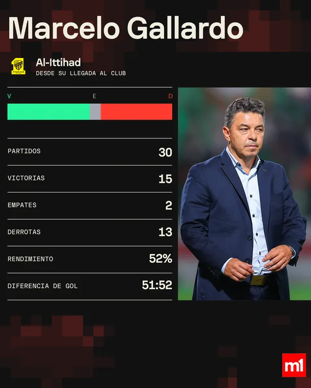 Menos de seis meses fueron los que Gallardo estuvo al mando del conjunto de Arabia Saudita: si bien tenía contrato hasta Junio de 2025, los malos resultados fueron la clave de su salida. Fue eliminado de la Champions League de Asia en cuartos de final, igual que en el Mundial de Clubes. También quedó afuera en las semifinales de la King’s Cup y perdió la Supercopa de ese país.