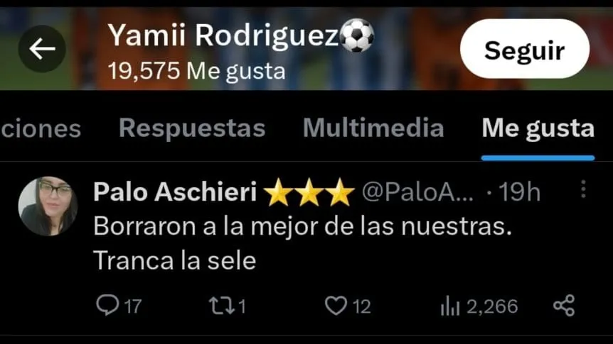 Apenas conocida la noticia, la exjugadora de Boca decidió primero desearle "todos los éxitos" al combinado nacional. Acto seguido, comenzó la polémica. Primero, con un emoji de una cara llorando junto a un corazón roto y, después, dándole "me gusta" a un tweet más que elocuente: "Borraron a la mejor de las nuestras. Tranca la sele".